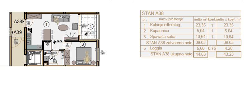 Stan ukupne površine 43,23 m² sastoji se od otvorenog koncepta kuhinje, dnevnog boravka i blagovaonice, spavaće sobe te moderne kupaonice. Posebnu vrijednost daje loggia, idealna za boravak tijekom cijele godine. Stanu pripada i garažno mjesto smješteno u podzemnoj etaži zgrade.