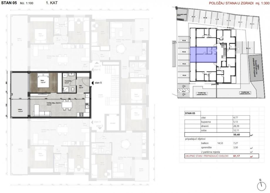 Stanu će također pripadati dva parkirna mjesta i ostava od 3,50 m2 u prizemlju zgrade.