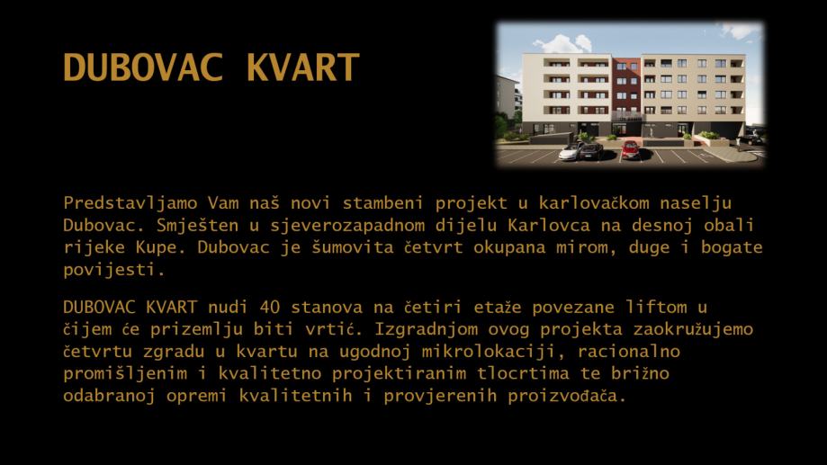 DUBOVAC KVART, moderna novogradnja sa 40 stanova i planiranim vrtićem u Karlovcu na izuzetnoj lokaciji koja svakodnevne životne potrebe čini jednostavnijima.