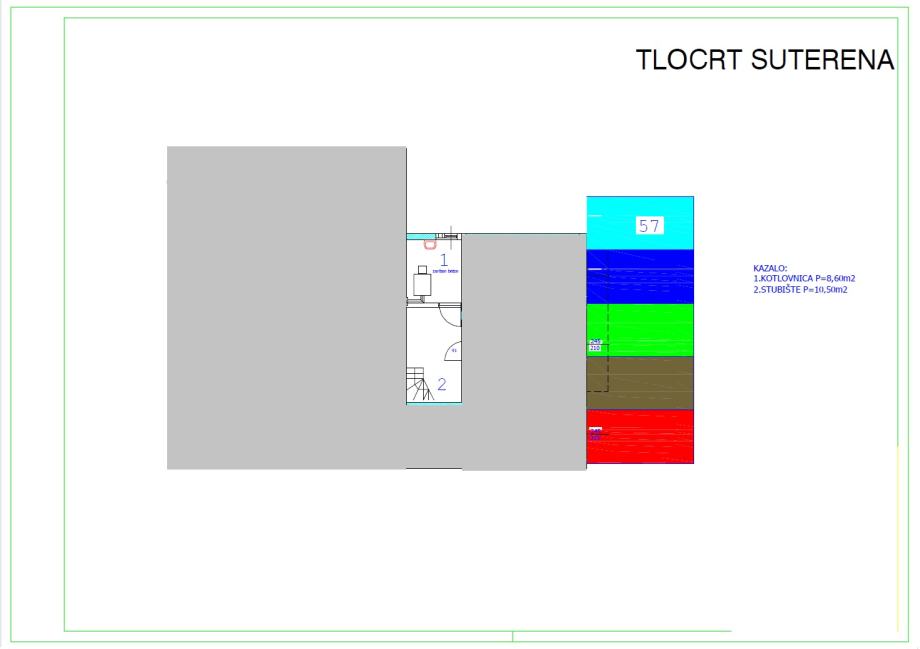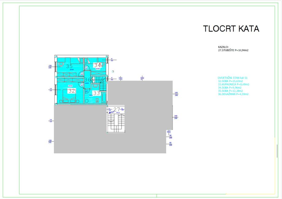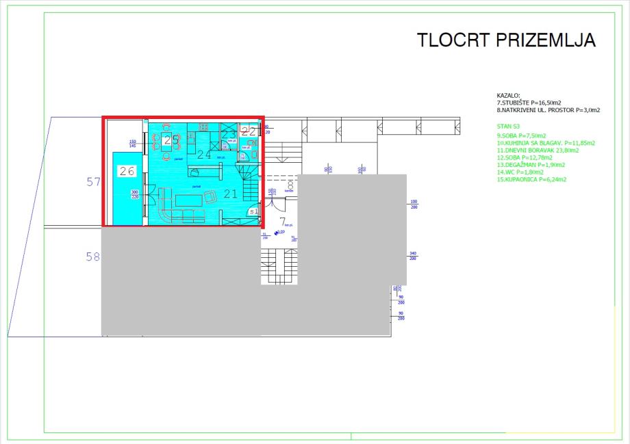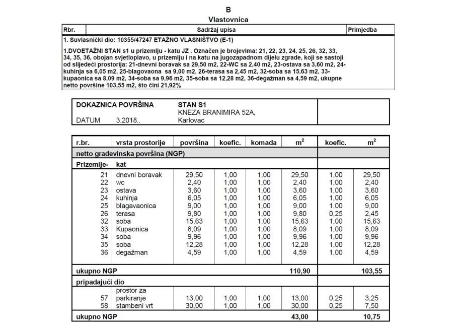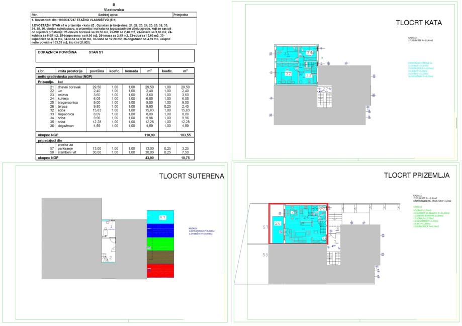 1.DVOETAŽNI STAN s1 u prizemlju - katu JZ . Označen je brojevima: 21, 22, 23, 24, 25, 26, 32, 33, 34, 35, 36, obojan svjetloplavo, u prizemlju i na katu na jugozapadnom dijelu zgrade, koji se sastoji od slijedeći prostorija: 21-dnevni boravak sa 29,50 m2, 22-WC sa 2,40 m2, 23-ostava sa 3,60 m2, 24-kuhinja sa 6,05 m2, 25-blagovaona sa 9,00 m2, 26-terasa sa 2,45 m2, 32-soba sa 15,63 m2, 33-kupaonica sa 8,09 m2, 34-soba sa 9,96 m2, 35-soba sa 12,28 m2, 36-degažman sa 4,59 m2, ukupne netto površine 103,55 m2.