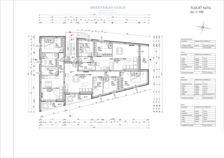 Iz ponude izdvajamo: S2, jednosoban stan od 43,70m2, položen na prvom katu, cijena je 3.500€/m2 = 152.950€, orijentacije: jug-zapad.