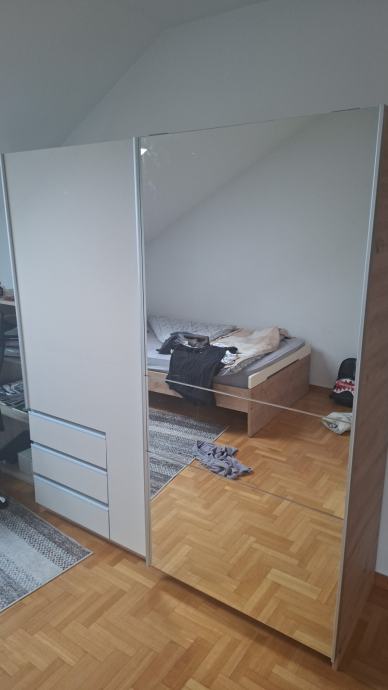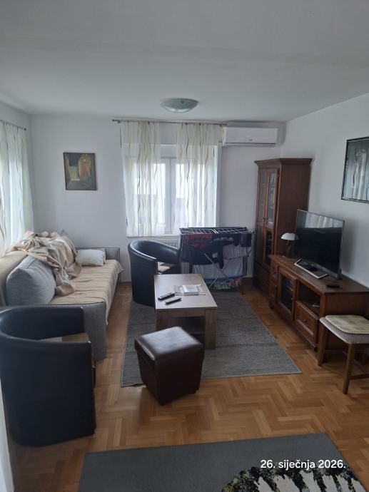 Namještaj nije u cijeni, ali postoji mogućnost dogovora za dijelove namještaja, ugradbena kuhinja sa novim aparatima ostaje u stanu.
