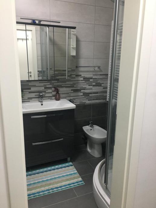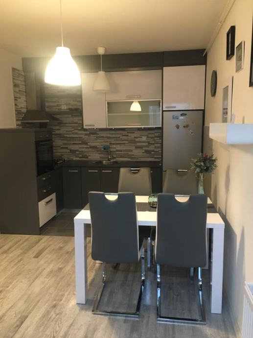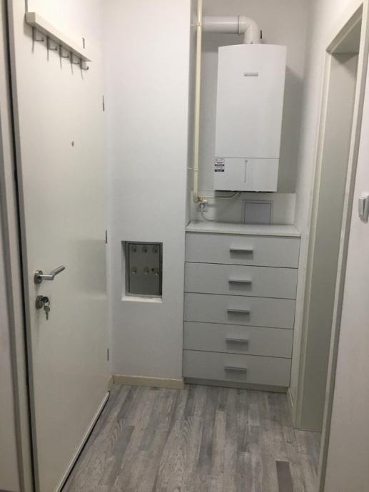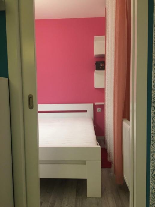 Prodajem manji dvosobni stan (41m2). Stan ima dnevni boravak sa staklenom stijenom prema balkonu, spavaću sobu, kuhinju s blagovaonom, kupaonicu i hodnik. Stanu pripada vanjsko parkirno mjesto i spremište u podrumu zgrade. Prodaje se kompletno namješten i sa svim aparatima (uključujući kuhinju po mjeri, klima uređaj...).