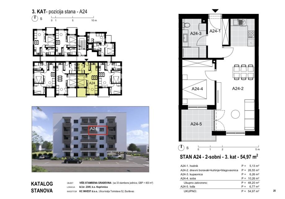 Stan S 24 se nalazi se na 3. katu površine od 54,97 m2 koji se sastoji od hodnika 5,13m2, kupaonice 6,26m2, dnevnog boravka , blagovaonice i kuhinje 26,55 m2,spavaće sobe 10,26 m2 , i lođe 6,77m2