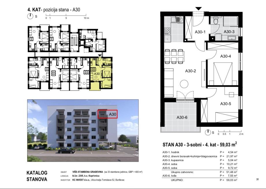 Stan S 30 se nalazi se na 4. katu površine od 59,03 m2 koji se sastoji od hodnika 4,54 m2, kupaonice 5,04m2, dnevnog boravka , blagovaonice i kuhinje 21,97 m2,spavaće sobe 10,21 m2 , spavaće soba 9,72m2 i lođe 7,55m2
