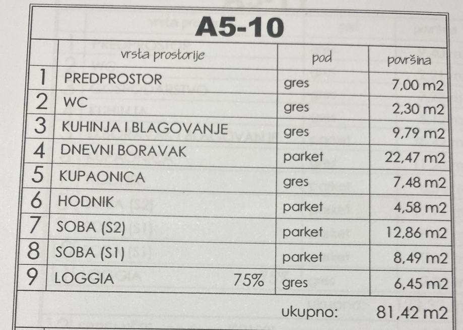 Prodaje se lijepo dizajniran stan na 5 katu (ukupne povšine 81,42m2), namješten sa modernim ugradbenim ormarima i vitrinama, kuhinja (3x4 m2 - Gorenje sa ugradbenim aparatima), dnevni boravak, blagovaona, velika spavaća soba (sa mogučnosti pregrađivanja u 2 manje), kupaona (cca.7,48 + wc), hodnik, loggia (cca.6,45m2).