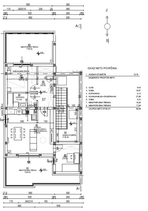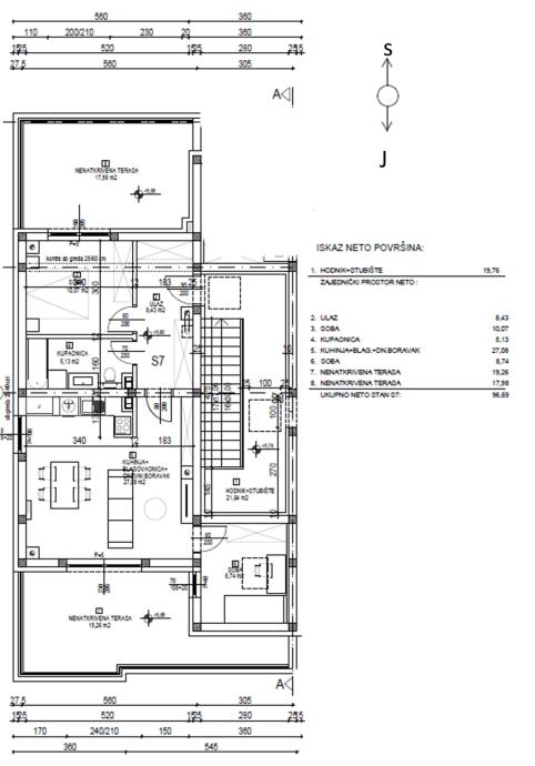 Stan se sastoji od ulaznog hodnika u površini 8,43 m2, kupaonice površine 5,19 m2, kuhinje+blagovaonice + dn boravka od 27 m2 , spavaće sobe 10,07 m2, sobe 8,96 m2 te dvije terase jedne površine 19,22 m2 a druge 17,84 m2.