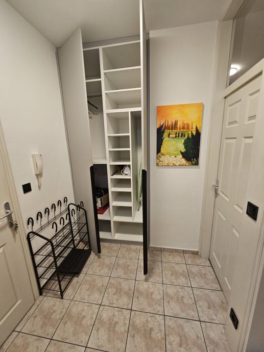 Stan se sastoji od spavaće sobe, dnevnog boravka s kuhinjom i blagovaonicom, kupaonice, hodnika i lođe. U potpunosti je namješten i opremljen: klima uređaj, perilica/sušilica rublja, perilica posuđa, TV. Uz stan je na raspolaganju i spremište za pohranu u podrumu te jedno nenatkriveno parkirno mjesto (parkinzi nisu označeni, ali su uvijek dostupni).