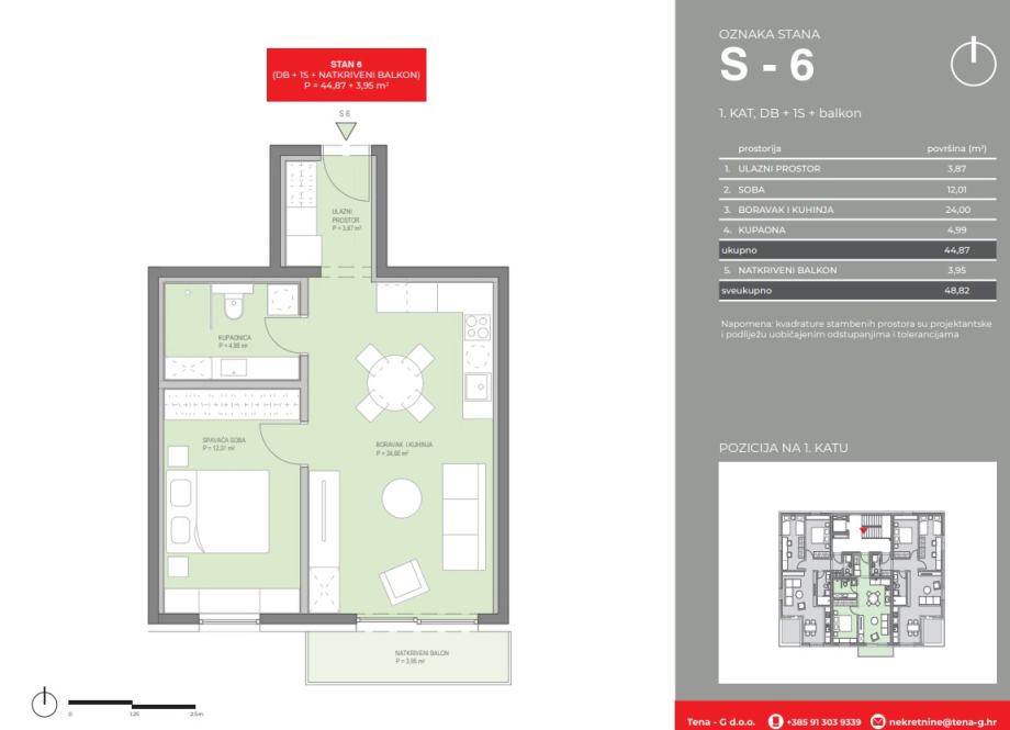 Tlocrt i površina: Ukupna površina stana: 48,82 m2