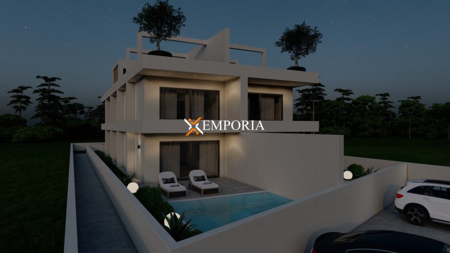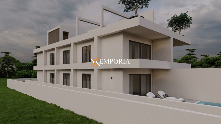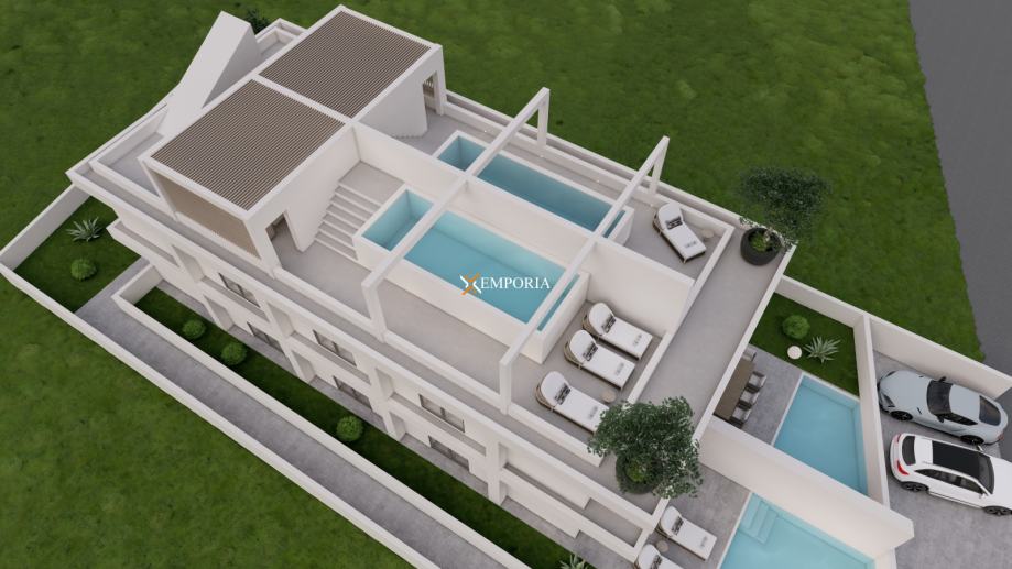 Iz zajedničkog stubišta pristupa se privatnoj krovnoj terasi na kojoj se nalaze natkrivena ljetna kuhinja (17,84 m²) i bazen površine 14,72 m² (neto 7,36 m²).