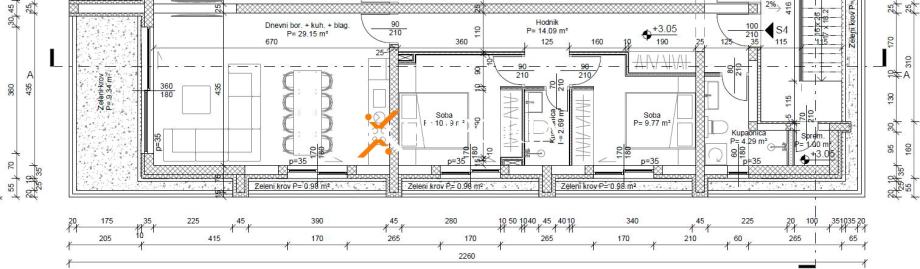 Das Gebäude wird hauptsächlich aus Betonwänden und teilweise aus Thermoziegeln errichtet. Auf der Dachterrasse befindet sich ein gemauerter Grill.