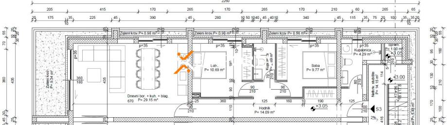 Neto korisna površina zatvorenog dijela stana iznosi 95,46 m². Sastoji se od hodnika, dvije spavaće sobe, kupaonice, kuhinje s blagovaonicom i dnevnim boravkom, te natkrivene terase. Unutarnjim stubištem iz zajedničkog hodnika pristupa se krovnoj terasi na kojoj se nalazi natkrivena ljetna kuhinja površine 17,84 m² i bazen površine 14,72 m² (neto 7,36 m²).