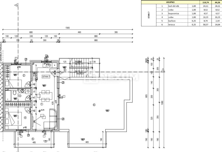 Stan oznake S7, nalazi se na trećem katu zgrade sa ukupno 7 stanova. Stan ima ukupnu neto korisnu površinu od 114,74m2, od čega unutarnja površina stana iznosi 47,43 m2, površina balkona iznosi 8,74m2, a površina krovne terase 58,57m2.
