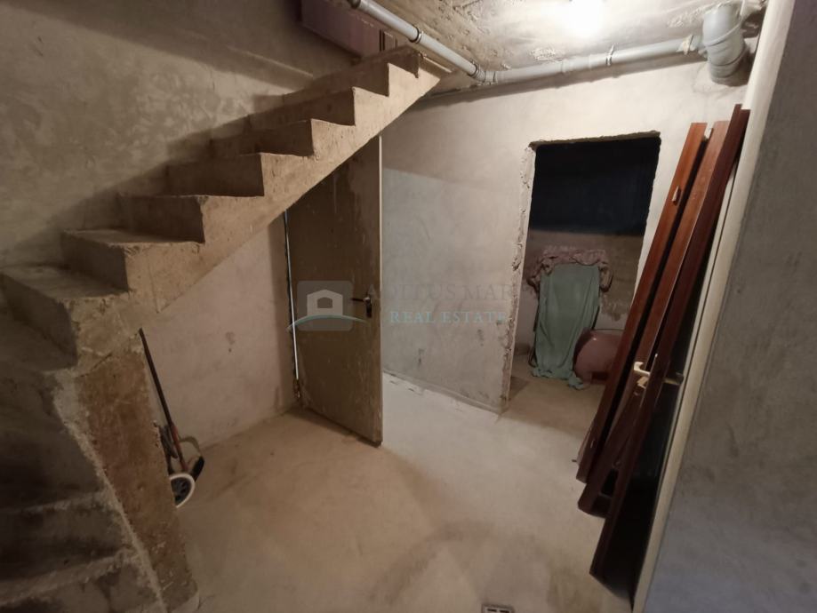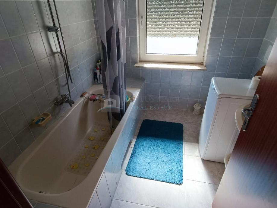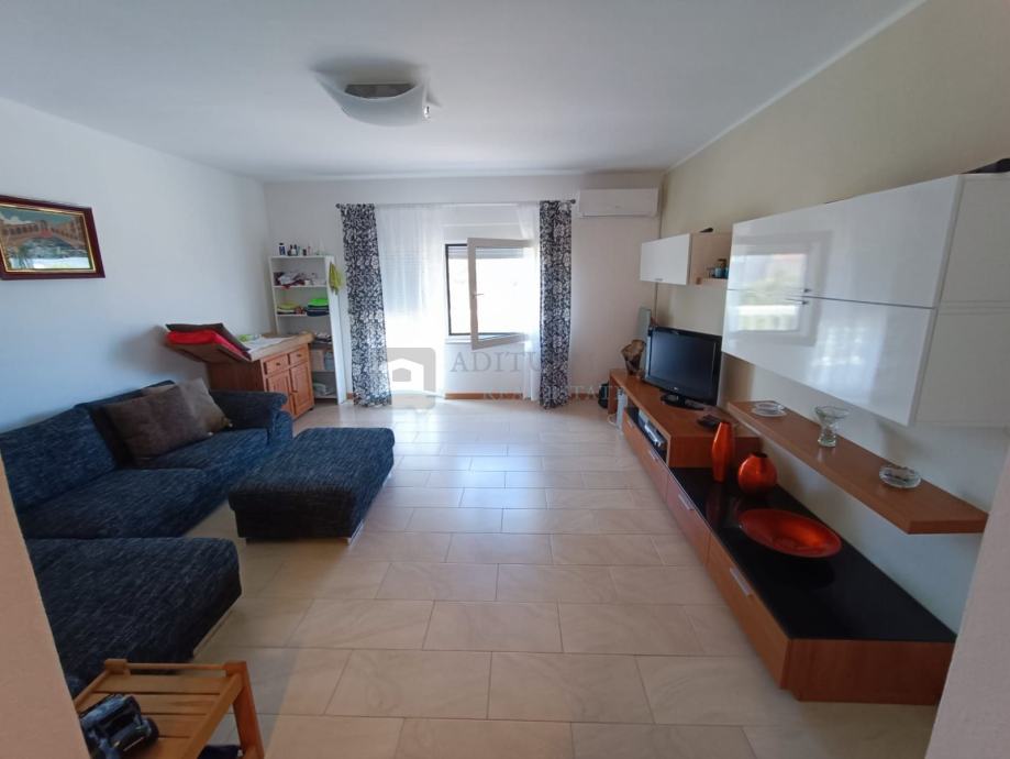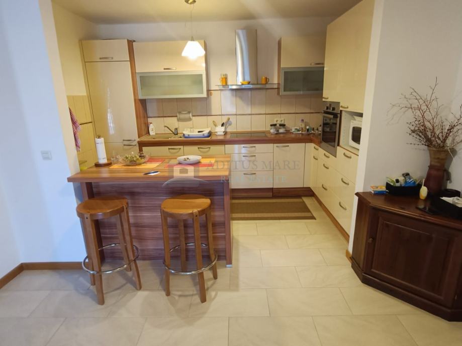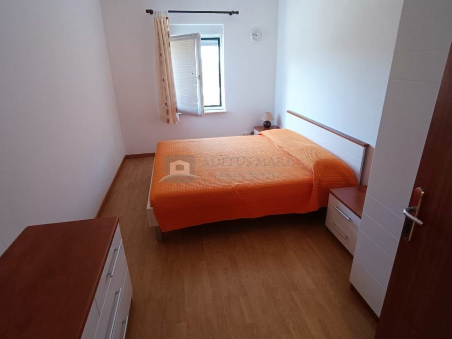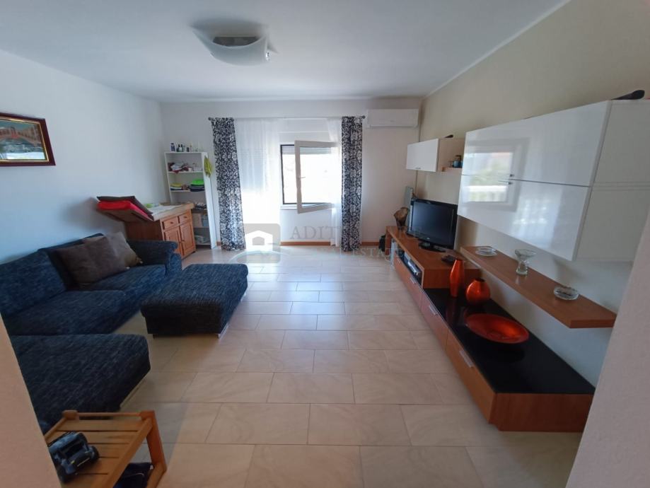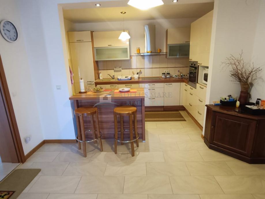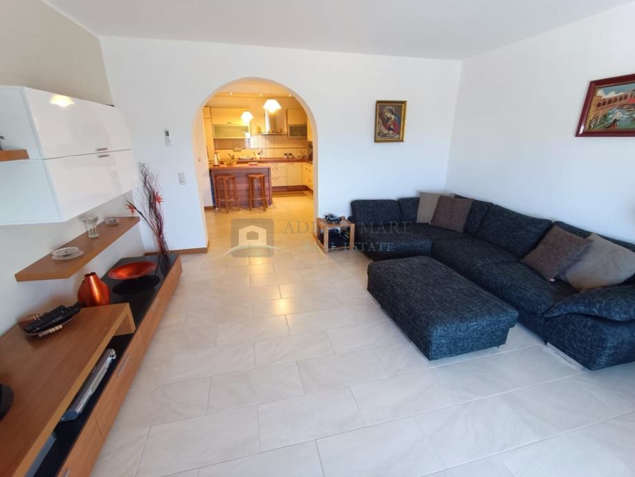 Stan se sastoji od velike i prostrane terase s koje ima djelomičan pogled na more (jedan dio terase natkriven), kuhinje i dnevnog boravka koji ima izlaz na terasu, tri spavaće sobe, WC, kupaonica, podrum s dvije prostorije.