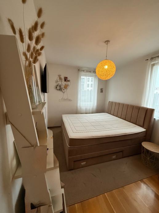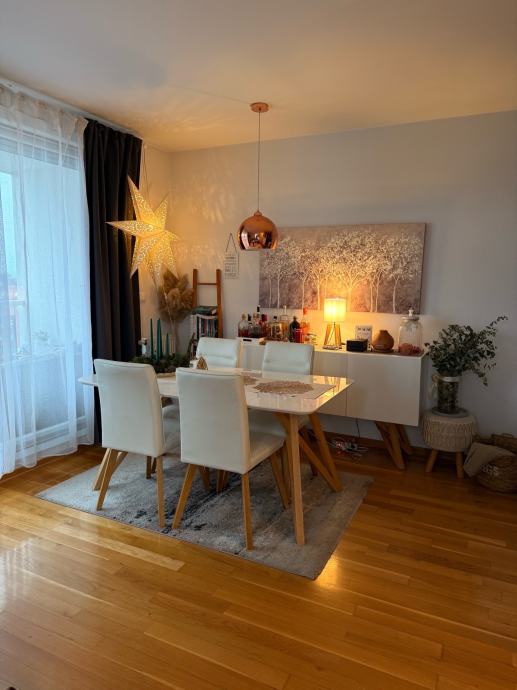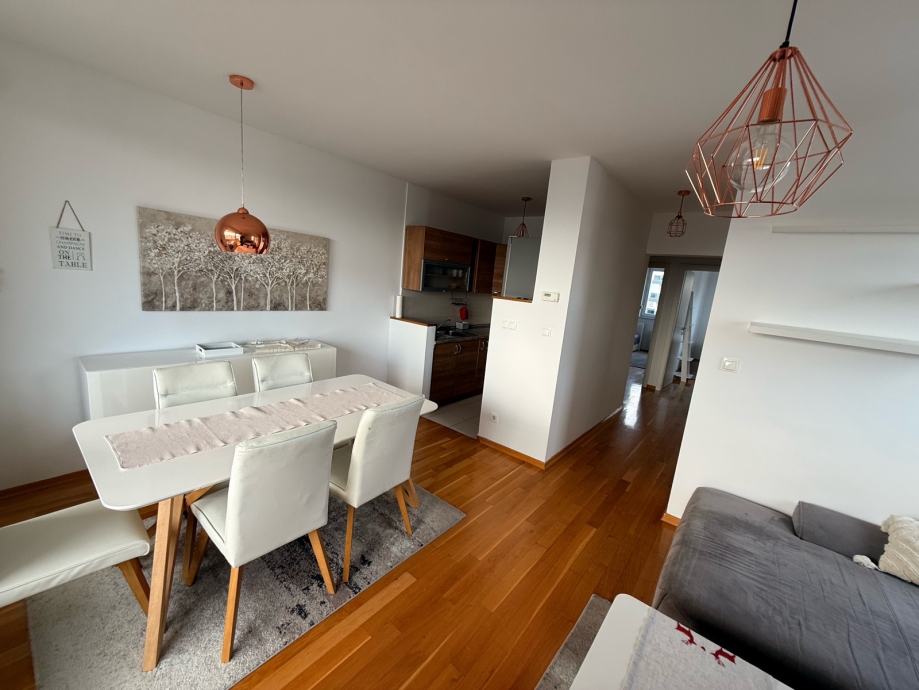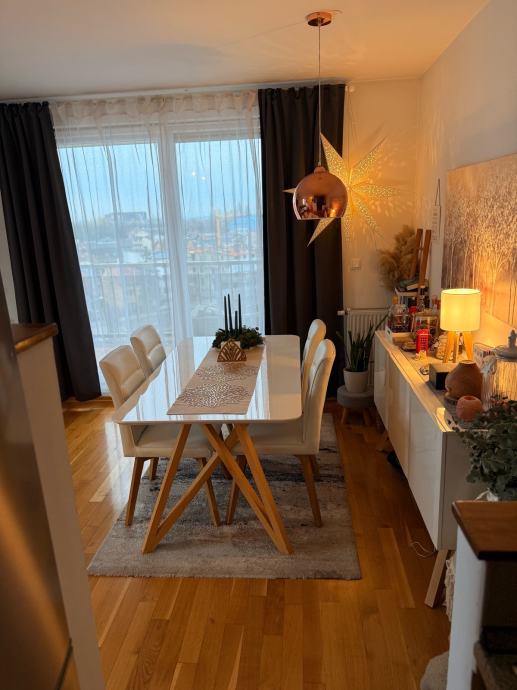 Prodaje se POTPUNO NAMJEŠTEN stan na Laništu, 61.25 m2, prekrasne orijentacije na tri strane svijeta, s puno prozora i velikom staklenom stijenom s kliznim vratima u boravku.