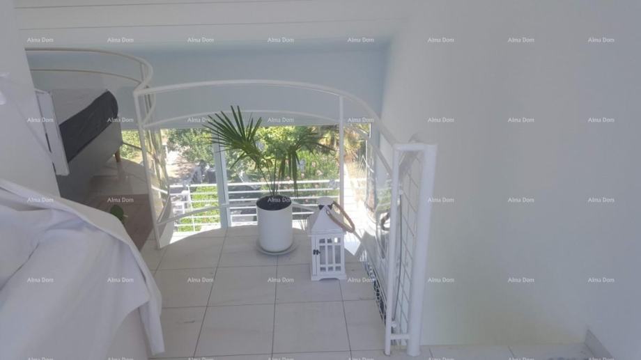Stan površine 72m2, uključuje dnevni boravaka sa kuhinjom i blagavaonom, dvije spavaće sobe, dvije kupaone i dvije terase. Jadna terasa gleda direktno na more, a druga na dvorište i zelenilo koje okružuje nekretninu.