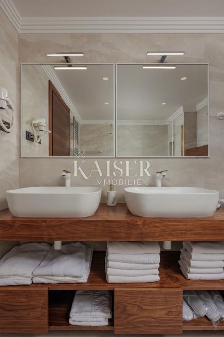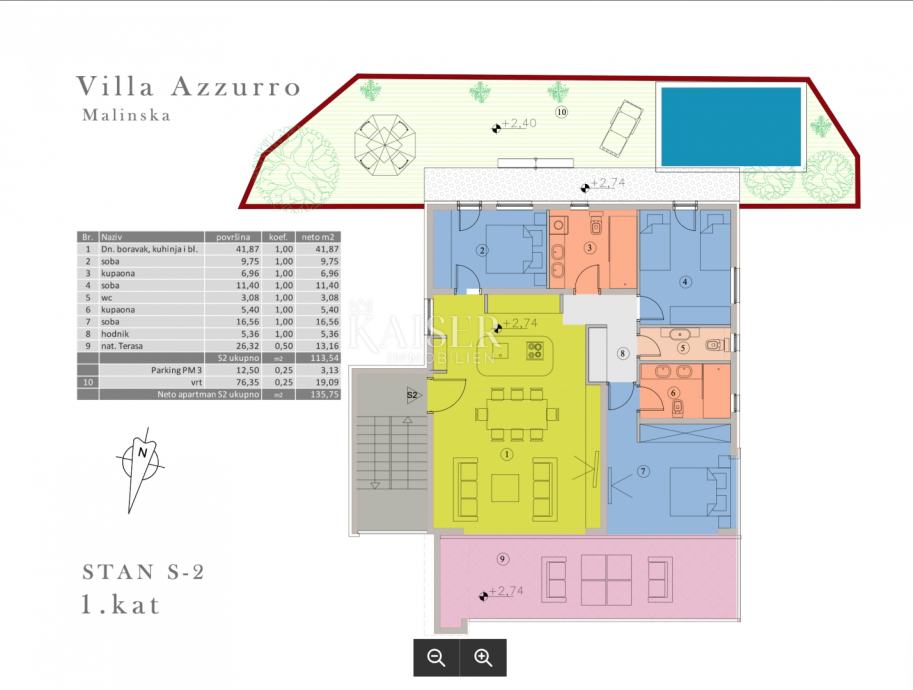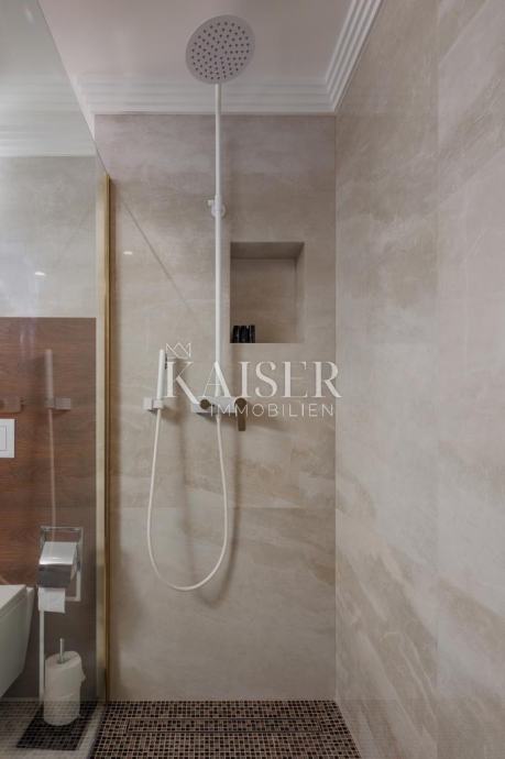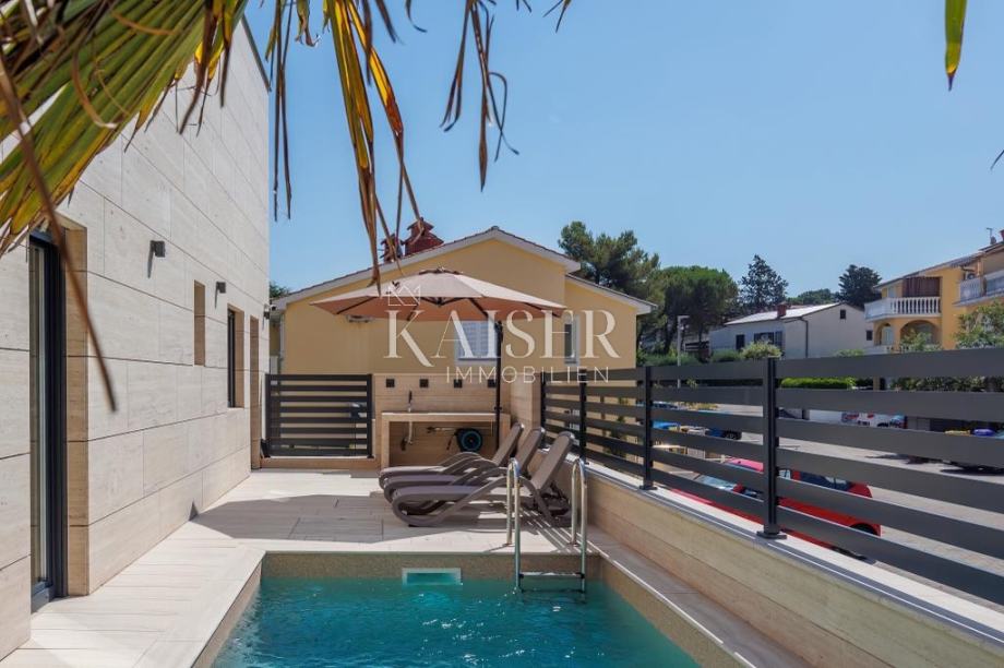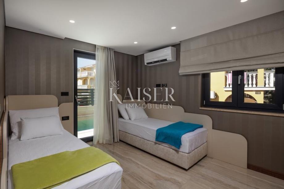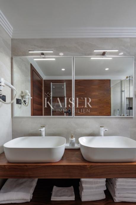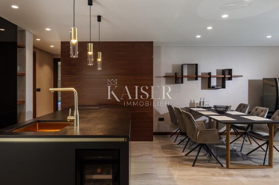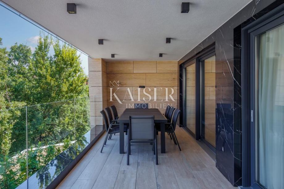 Kaiser Immobilien nudi stan na prvome katu u luksuznoj villi 80 metara od mora. Villa je sagrađena 2022. godine te su pri gradnji korišteni najkvalitetniji materijali kao i inovativan način gradnje. U 126 m2 smještene su 3 spavaće sobe, svaka s pripadajućom kupaonicom, gostinjski toalet te veliki dnevni boravak s kuhinjom. Stanu pripada i velika natkrivena terasa veličine 26 m2. Za potpuni užitak tu je i velika privatna okućnica površine 76 m2 gdje se nalaze bazen i vrt.