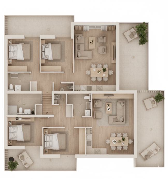 60 m² stambenog prostora s open space dnevnim boravkom, kuhinjom i blagovaonicom koje se prirodno povezuju s natkrivenom terasom za uživanje u pogledu i blagim mediteranskim večerima