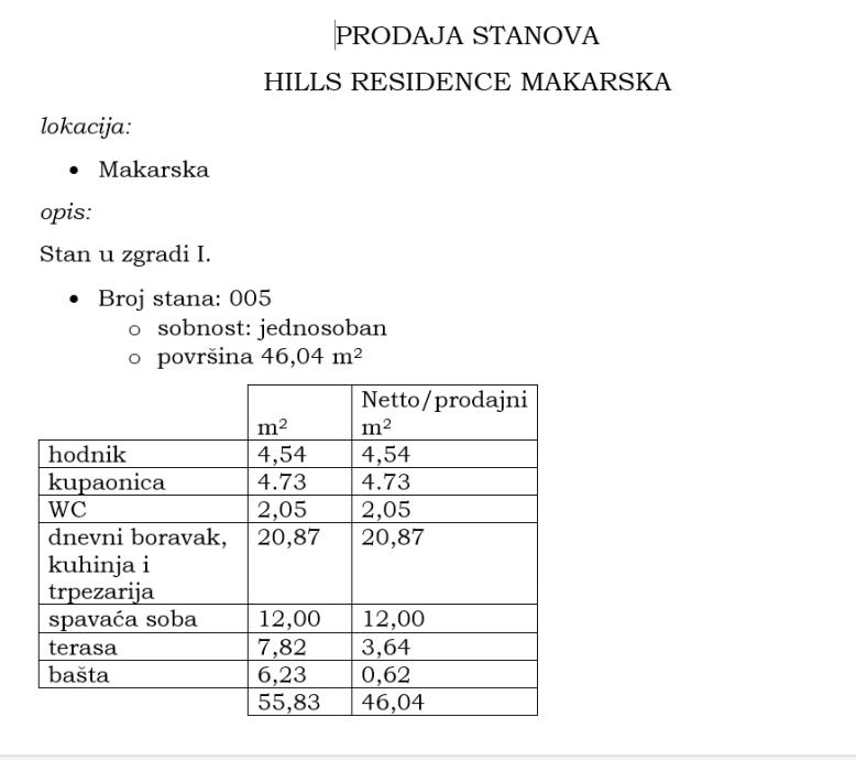 Prodaje se jednosobni stan u prizemlju Hills residence 1 Makarska u sklopu luksuznog kompleksa sa 2 bazena i 2 jacuzzija sa dosta zelenila i pogledom na more.