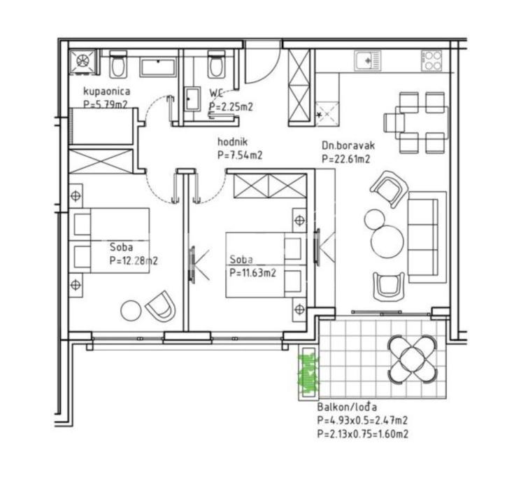 Ovaj stan se nalazi u zgradi broj 1, a površina stana iznosi 66,17 m² i sastoji se od: kupaonice (5,79 m²), WC-a (2,25 m²), hodnika (7,54 m²), dnevnog boravka s blagovaonicom (22,61 m²), dvije spavaće sobe (12,28 m² i 11,63 m²), balkona/lođe (4,93 m² i 2,13 m²)