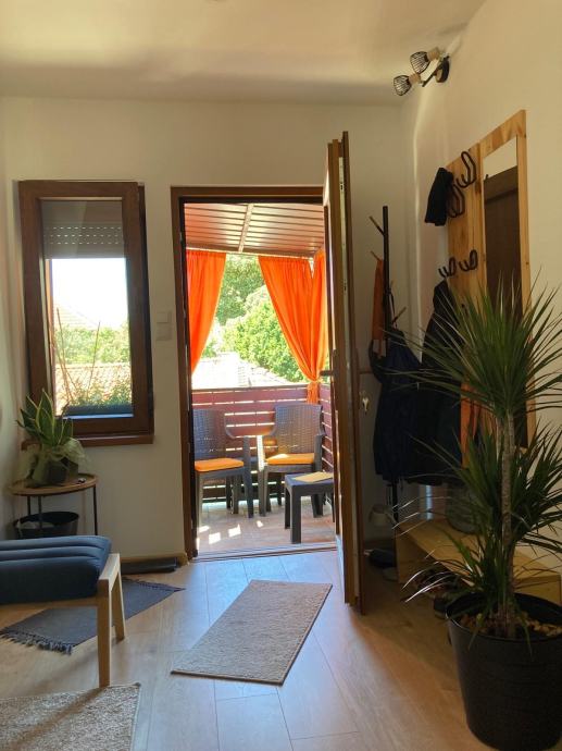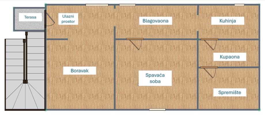 Ukupna podna površina stana iznosi 71 m2, ima vlastito vanjsko stubište, terasu i zidano spremište od 6,5 m2 u prizemlju zgrade.