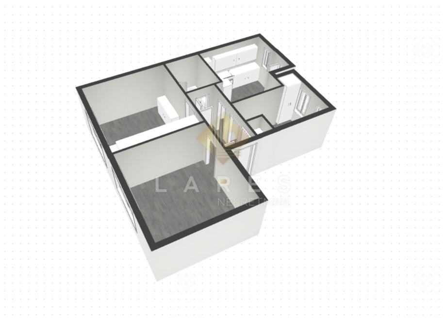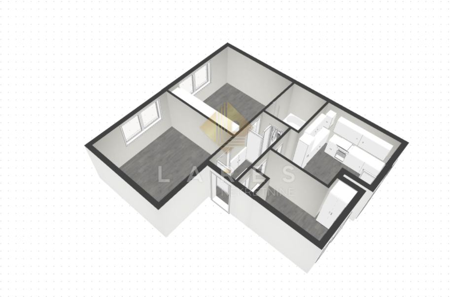 - Sastoji se od hodnika, kupaonice, prostranog dnevnog boravka, kuhinje s blagovaonicom te dvije spavaće sobe.