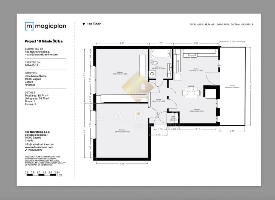 - Zatvorene površine stana iznose 74,05 m2, a uz to ima i nenatkrivenu terasu od 13,98 m2 te spremište u dvorištu površine 4,46 m2.