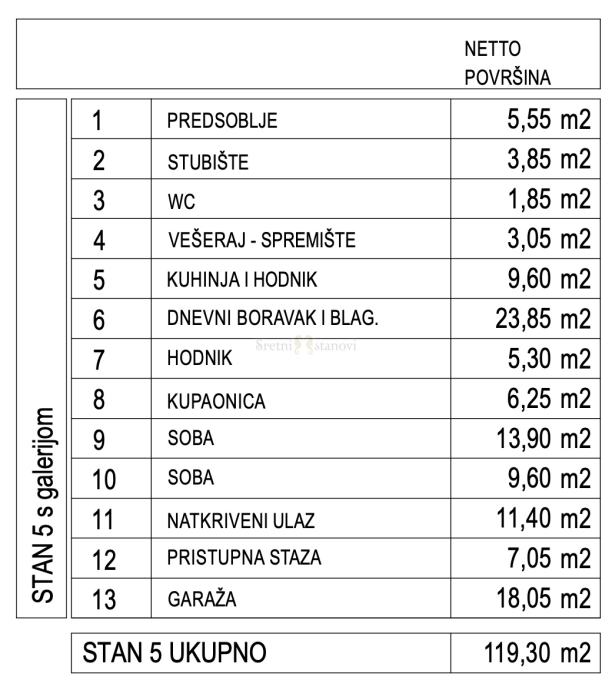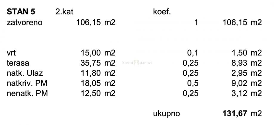 Stan ima poseban ulaz. Sastoji se od 106.15 m2 unutarnje površine (1.kat - ulazni hodnik, stubište, WC, spremište, dnevni boravak s kuhinjom; 2. kat - 3 spavaće sobe i kupaona), natkrivenog ulaza 11.80m2, garažnog parkirnog mjesta 18.05 m2 i vanjskog parkirnog mjesta 12.50 m2.