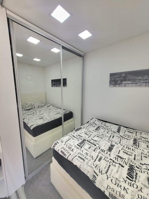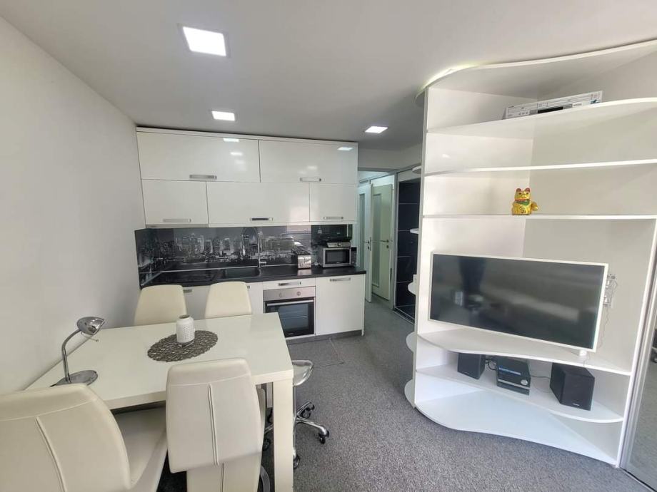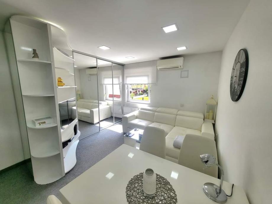 Na podu je vuneni antialergijski tepih u cijelom stanu. Tu je i savršena kožna bijela garnitura koja se izvlači u udoban ležaj, zatim stol i stolice, ugradbeni ručno rađeni ormari sa kliznim ogledalima za garderobu i cipele, nova posteljina, ručnici, jastuci i popluni.