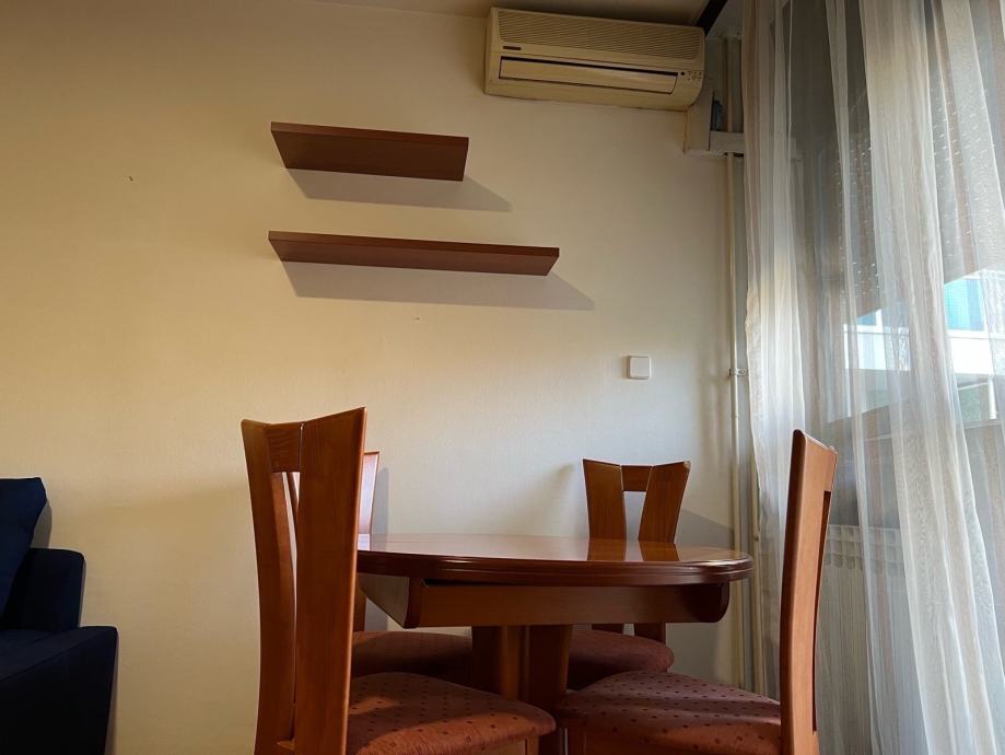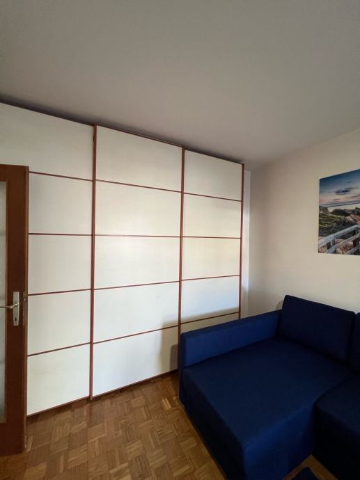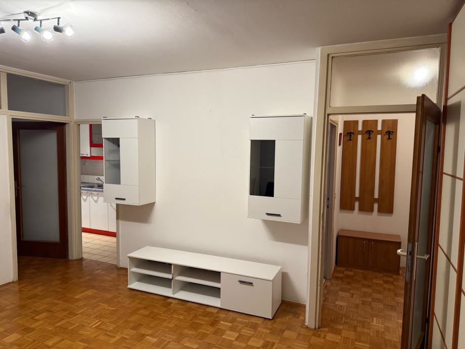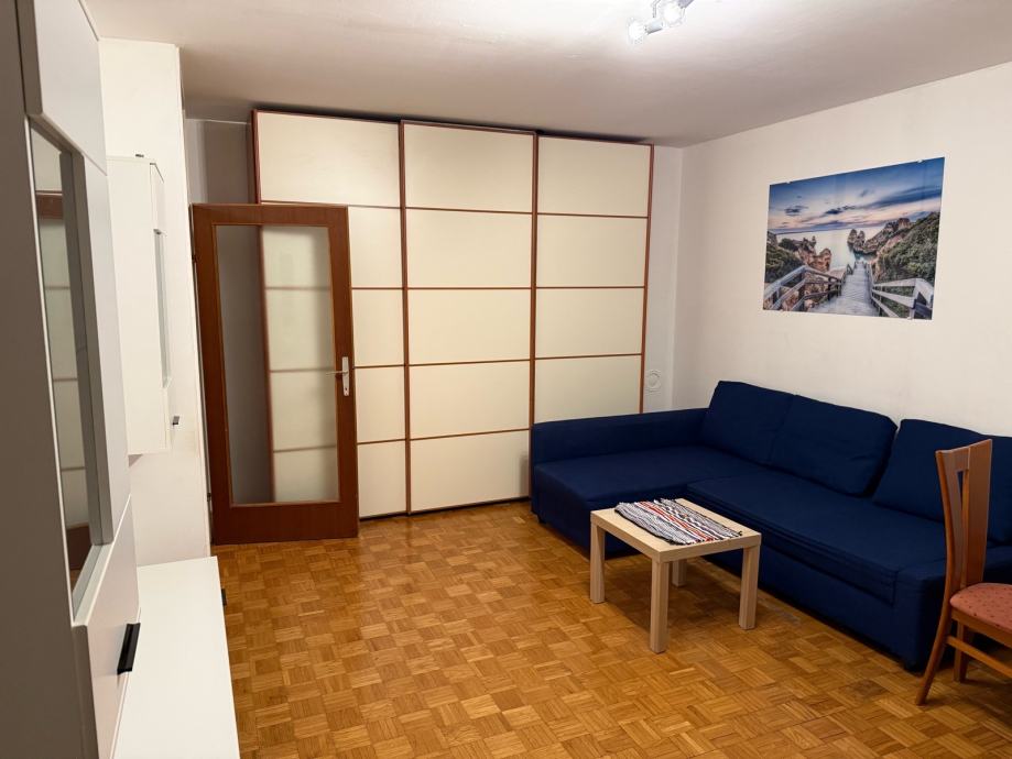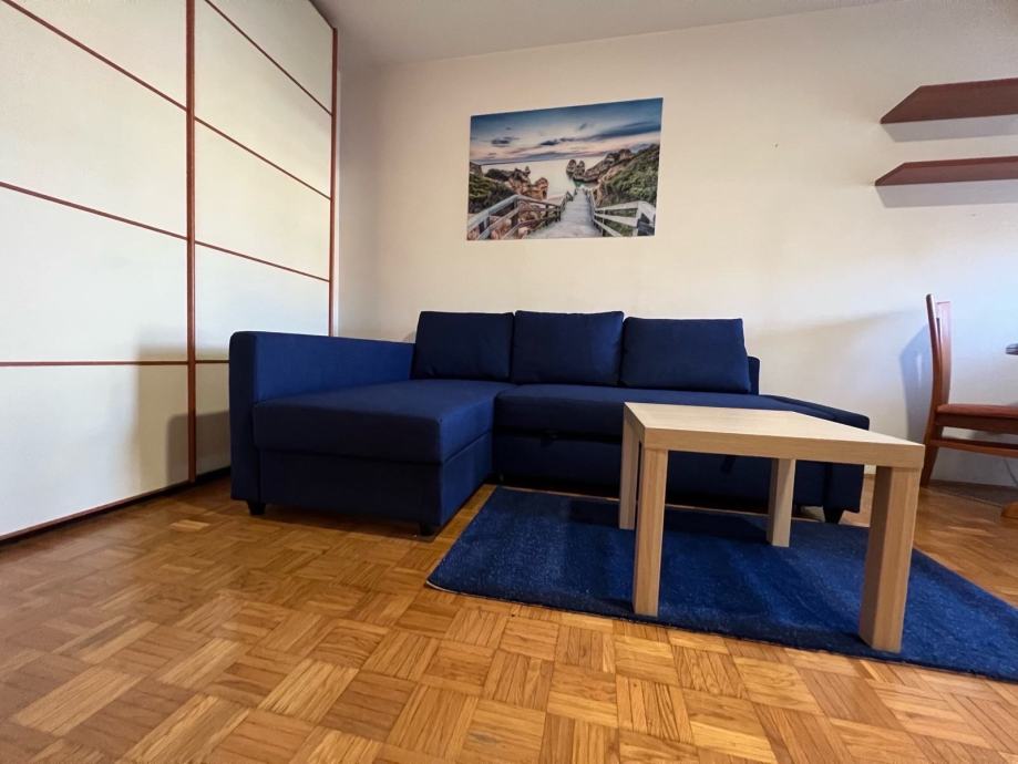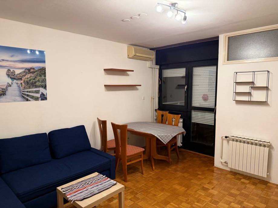 1,5 soban stan (dnevni boravak + sobica) od 43,5 m² na drugom katu četverokatnice u Malešnici, izgrađene 1999. godine. Stan je orijentiran prema istoku i parku te potpuno namješten - dnevni boravak opremljen je kutnom sofom, stolićem, blagovaonskim stolom sa stolicama i velikim ugradbenim ormarom s kliznim vratima koji zauzima cijeli zid, iznajmljuje se na duže vrijeme.