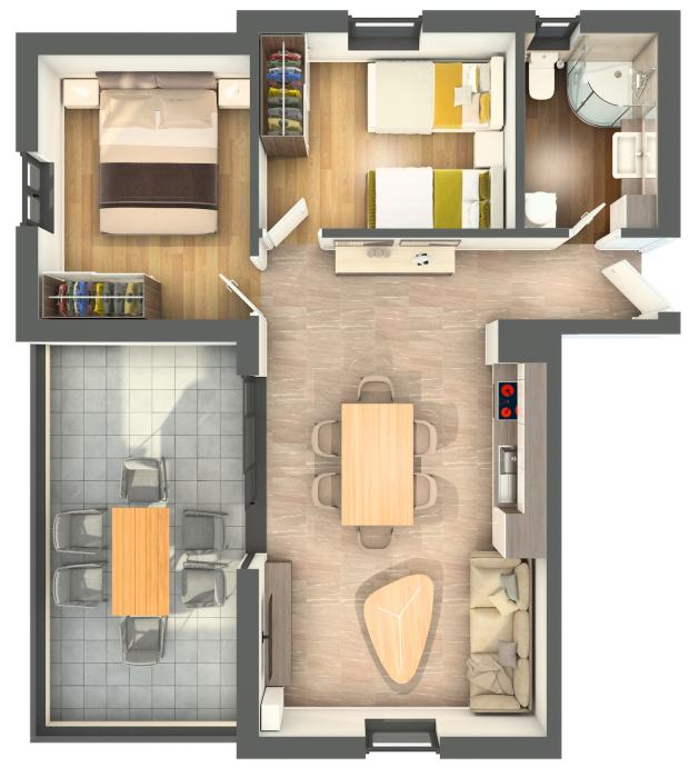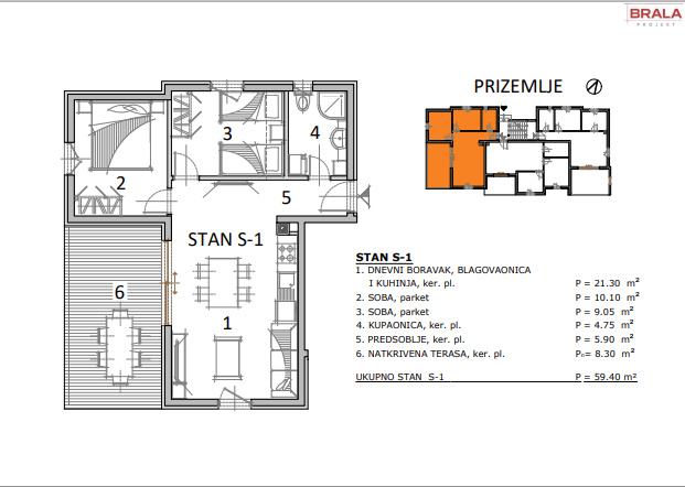 Prodaje se prekrasan trosoban stan M-S-1 obračunske površine 59,40 m2 u prizemlju visokokvalitetene moderne zgrade od dva kata i potkrovljem u izgradnji s ukupno 8 stanova i 2 apartmana, a koji se sastoji od ulaznog hodnika, dnevnog boravka s kuhinjom i blagavaonom, dvije spavaće sobe, kupaonice s WC-om i terasom.