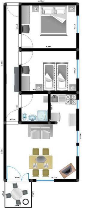 Apartmani imaju po dvije spavaće sobe, te prostrani dnevni boravak i kuhinju u potpunosti namješteni za boravak. Od mora i prvih plaža udaljeni 150m.