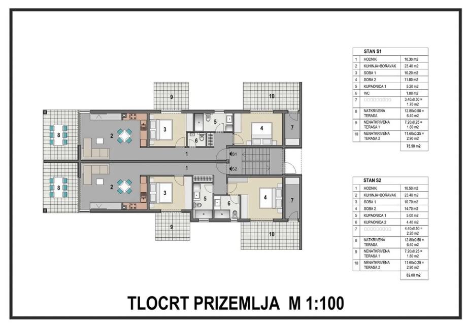 Sastoji se od hodnika, dnevnog boravka s kuhinjom i blagovaonom, 2 sobe, 2 kupaonice s wc-om, male ostave, 3 natkrivene terase i vrta površine 170,10 m2 (obračunski 17.01 m2).
