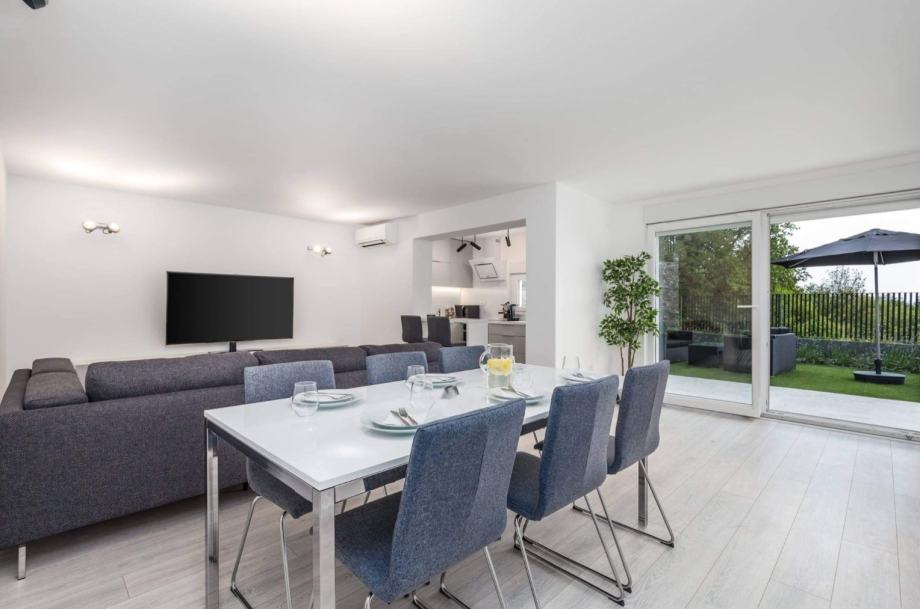 Ako tražite stan za najam u mirnom okruženju, zelenilu s predivno uređenom okućnicom, onda je ovo prava nekretnina za vas. U ponudi je stan južne orijentacije u manjoj zgradi novijeg datuma koja je okružena zelenilom i uređenom okućnicom, te stanari na korištenje imaju bazen i terasu sa sunčalištem. Sa strane zgrade su osigurana parkirna mjesta. Stan se sastoji od open space dnevnog djela u kojem se nalaze prostorni dnevni boravak, blagavaonica i kuhinja. Stan je potpuno opremljen, uređen s ukusom i elegancijom. Iz dnevnog djela izlazi se na balkon s kojeg se pruža lijepi pogled. Nekretnina je puna sunca i svjetlosti, kuća je dobro izolirana, stolarija je nova, a grijanje je na klimu. Idealna nekretnina za obitelj, par koji želi boraviti u mirnom, prirodnom okruženju, a u isto vrijeme biti udaljen samo par minuta autom od Opatije ili Rijeke. Iznos mjesečne najamnine je 1.100,00 eura plus režije.