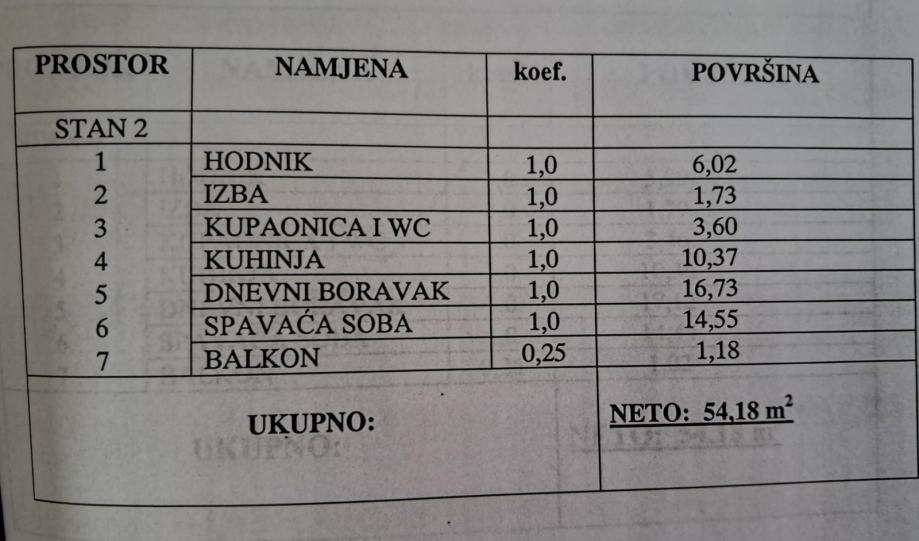 Stan ukupne površine 57,62 m2 koju sačinjava stan površine 54,18 m2 te pripadajući pomoćni prostor u podrumu 3,44 m2. Stan se sastoji od hodnika (6,02 m2), smoćnice (1,73 m2), kupaonice i wc-a (3,60 m2), kuhinje (10,37 m2), dnevnog boravka (16,73 m2), spavaće sobe (14,55 m2) i balkona (4,72 m2 x koef 0,25 = 1,18 m2).