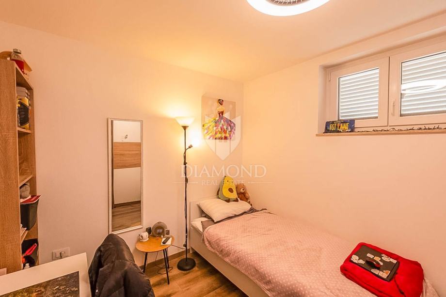 Stan se sastoji od dvije spavaće sobe, kuhinje, blagovaonice i dnevnog boravka koji čine ugodnu cjelinu za svakodnevni život ili odmor. Dnevni boravak je topao i ugodan, s dovoljno prirodnog svjetla i izlazom na privatnu, natkrivenu terasu – savršen prostor za jutarnju kavu, druženja s obitelji i prijateljima ili ljetne večeri. Posebnu vrijednost ovoj nekretnini daje mali, pažljivo uređen vrt, idealan za uzgoj začinskog bilja, cvijeća ili mini zelenog kutka. Vanjski prostor upotpunjuje uređena lounge zona i prostor za roštilj/vanjsku kuhinju, što stan pretvara u pravu malu mediteransku oazu. Zgrada u kojoj se stan nalazi nudi zajednički bazen na korištenje svim stanarima, što ovu nekretninu čini izuzetno atraktivnom za turistički najam, ali i kao drugi dom za odmor u Istri. Zbog rasporeda prostorija, šarmantnog eksterijera i pristupa bazenu, stan je odličan izbor za obiteljski stan ili apartman za odmor.