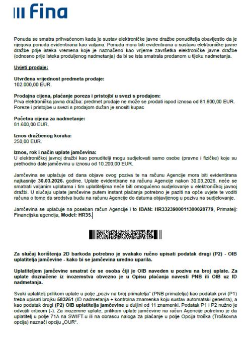 dražbi. U slučaju uplate jamčevine putem instant plaćanja potrebno je paziti na opće uvjete te voditi