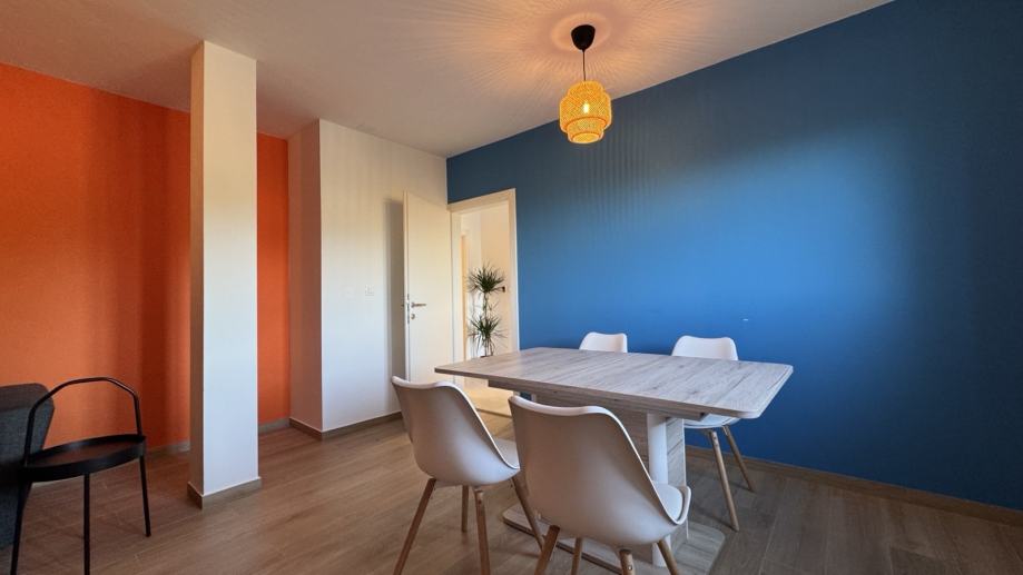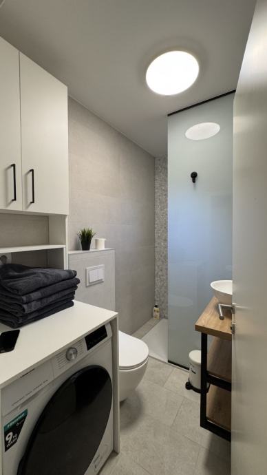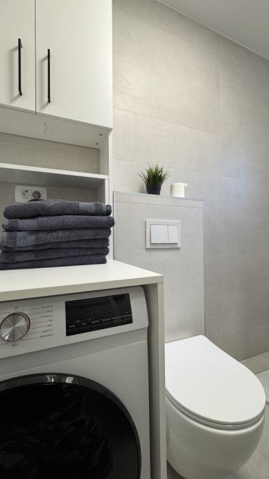 U stanu su potpuno novi namještaj i kućanski aparati (perilica-sušilica rublja, perilica suđa, pećnica, frižider, klima uređaj, dizalica topline…).