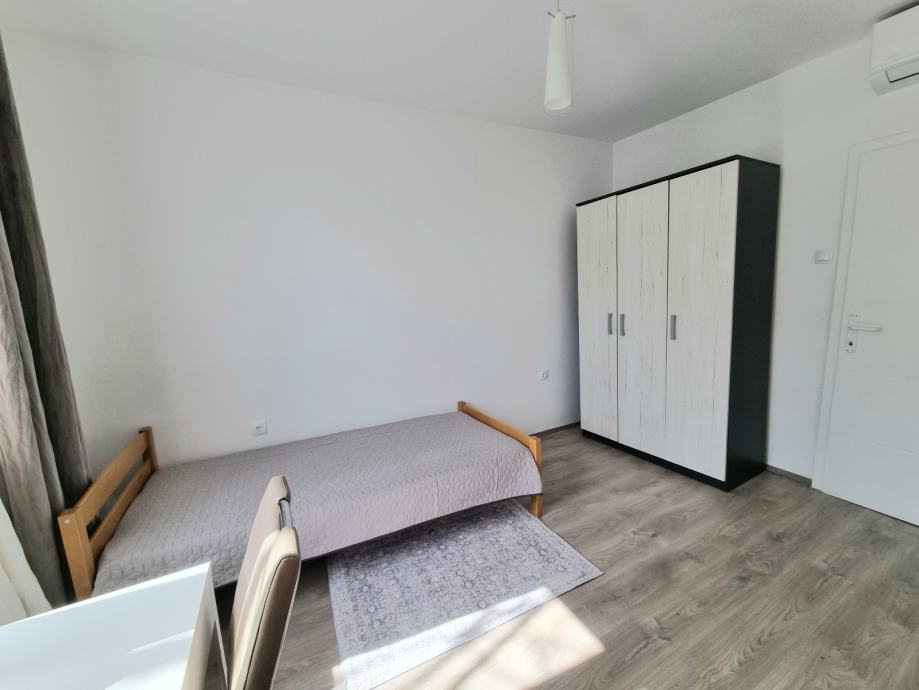 Sobe su namještene (krevet, ormar i radni stol), a svaka od njih opremljena je klima uređajem za grijanje i hlađenje (na struju). Stan ima mikrovalnu, perilicu i sušilicu za rublje (2 u 1) te indukcijsku ploču za kuhanje, kao i hladnjak s malom škrinjom.