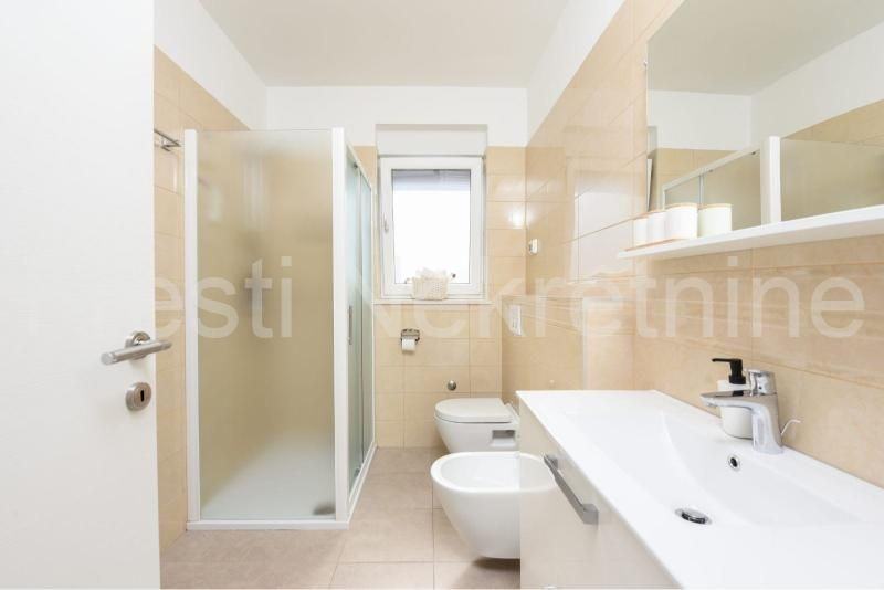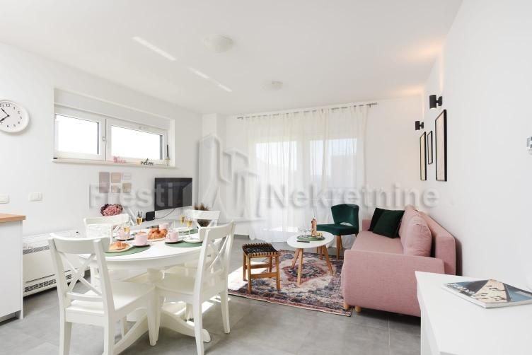 Ovaj suvremeni stan nalazi se na drugom katu zgrade, a pruža se površinom od 57.50 m2. Pomno osmišljen tlocrt stana pruža komfor a sastoji se od predsoblja, kuhinje i blagovaone s dnevnim boravkom u “open space” izvedbi, jedne spavaće sobe, kupaonice te natkrivene terase. Stan također posjeduje i dva parkirna mjesta, kompletno je namješten te se kao takav i prodaje.