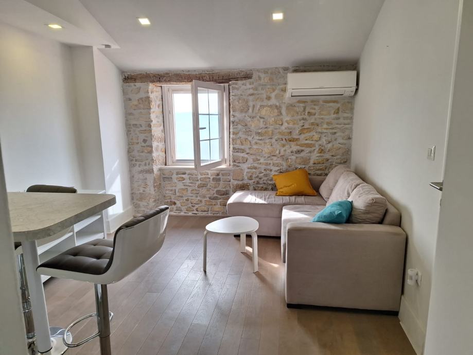 Stan se nalazi na drugom katu, apartmanske kuće u centru starog grada Motovuna. Sastoji se od dnevnog boravka spojenog s kuhinjom i spavaće sobe te kupaone. Apartman je obnovljen 2020 godine i od tad se iznajmljuje dugoročno tokom cijele godine. Cijena je 500 eura +150 eura paušal režije(struja, voda, čistoća). Nakon potpisivanja ugovora o najmu u općini se dobije kartica za besplatno parkiranje na javnom parkingu koji je udaljen 250metara. Polog je jedna stanarina i on se koristi kao zadnja stanarina kod odlaska.