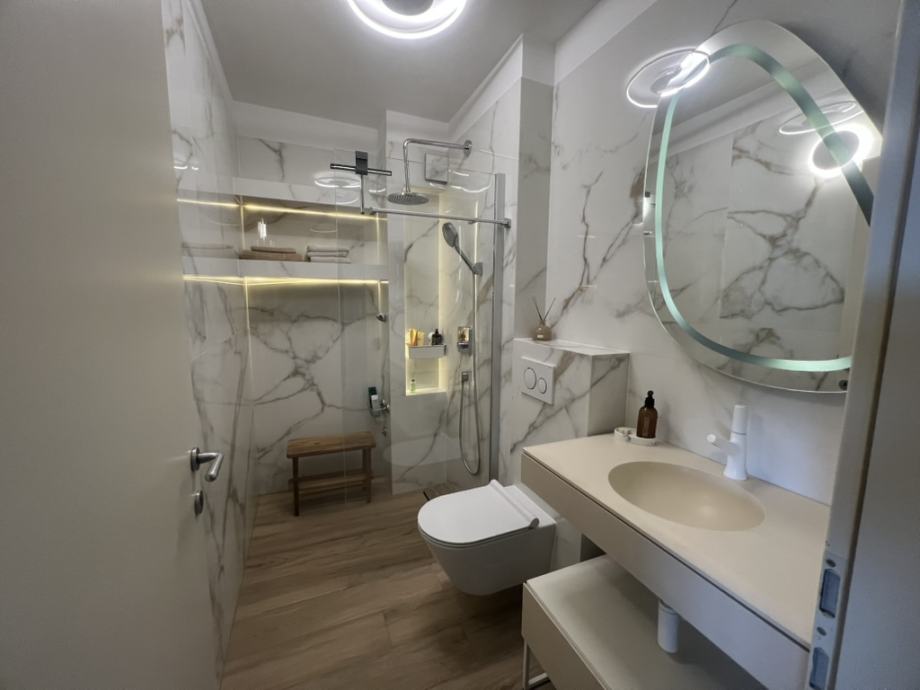 * Dizajnerska kupaonica s velikim keramičkim pločicama (240 cm) i prestižnim Poalgi namještajem