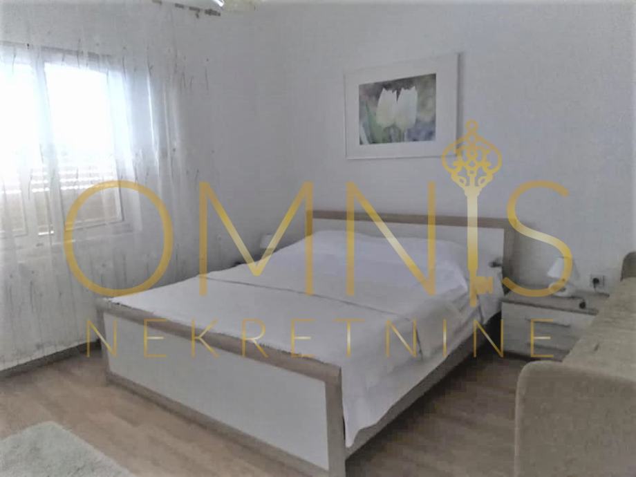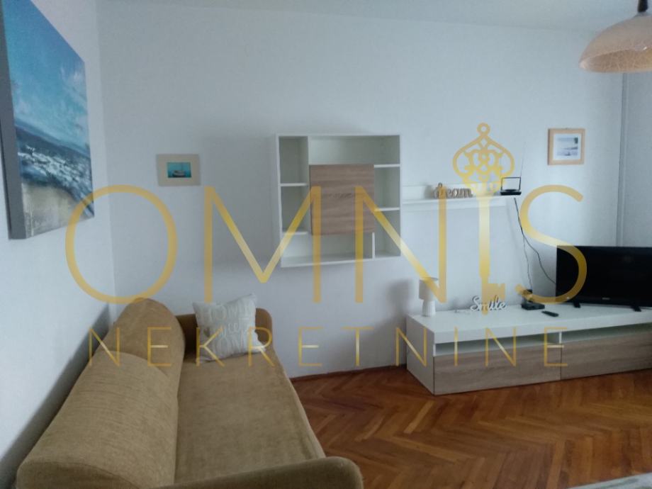 Stan uključuje prostrani dnevni boravak s izlazom na balkon i terasu, s kojih se pruža lijep pogled na more i okolinu. Postoji jedna spavaća soba, a prostor je dodatno opremljen kuhinjom s aparatima, perilicom posuđa, perilicom rublja, kadom, televizorom, krevetom i radnim stolom, što omogućuje udobno i funkcionalno stanovanje.