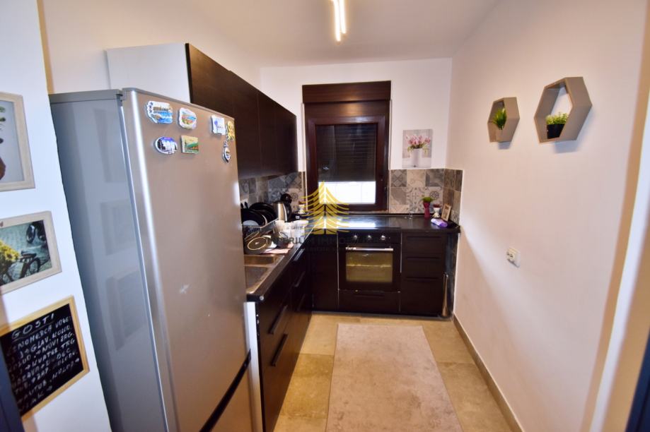 Stan je opremljen kuhinjom s aparatima, TV-om i krevetom, što omogućuje trenutnu useljivost bez dodatnih ulaganja. Za dodatnu udobnost, stan koristi plinsko centralno grijanje, a tu je i klima uređaj za hlađenje u toplijim mjesecima.