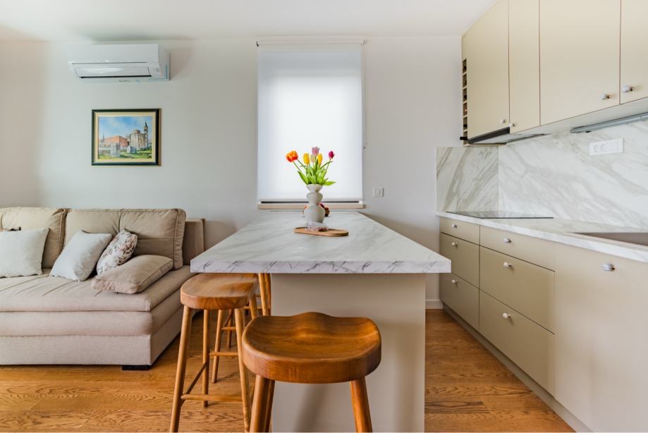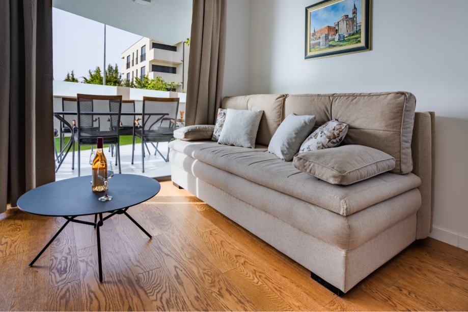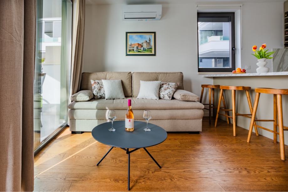 Iznajmljujemo novonamješten stan na Boriku, sa velikom terasom od 60m2. Kvart Borik-Vitrenjak izuzetno je mirno područje, smješteno svega pet minuta hoda od mora i marine uz koju se proteže prekrasna šetnica. Javni prijevoz nalazi se na tri minute hoda. Ovo je jedno od najljepših područja u Zadru za obiteljski odmor, s brojnim kvalitetnim restoranima i barovima u blizini. Također, u neposrednoj okolini dostupni su svi potrebni sadržaji, poput plaže, ljekarne, igrališta, benzinske postaje, škole i vrtića.