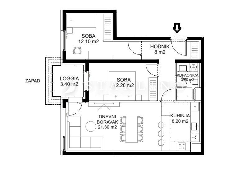 Stan se sastoji od dnevnog boravka s blagovaonicom i kuhinjom, 2 spavaće sobe, kupaonice s wc-om, hodnika i lođe.