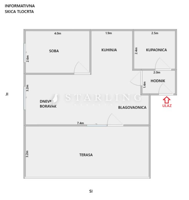 Stan se sastoji od dnevnog boravka s blagovaonicom i kuhinjom, spavaće sobe, kupaonice s wc-om, hodnika i terase.