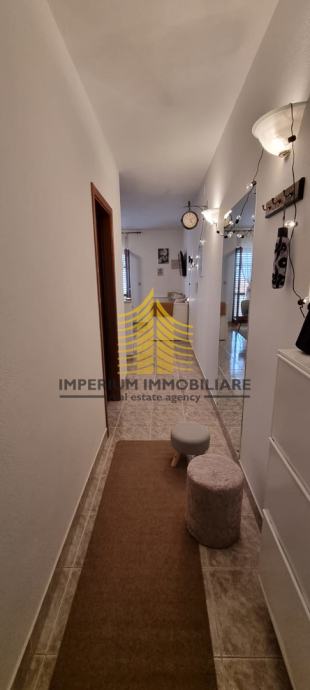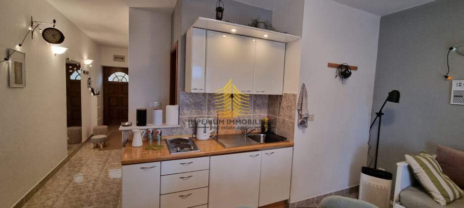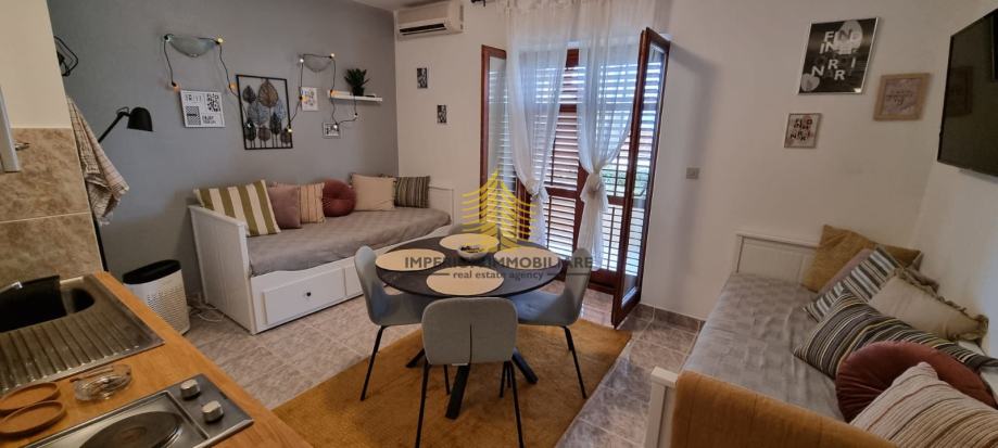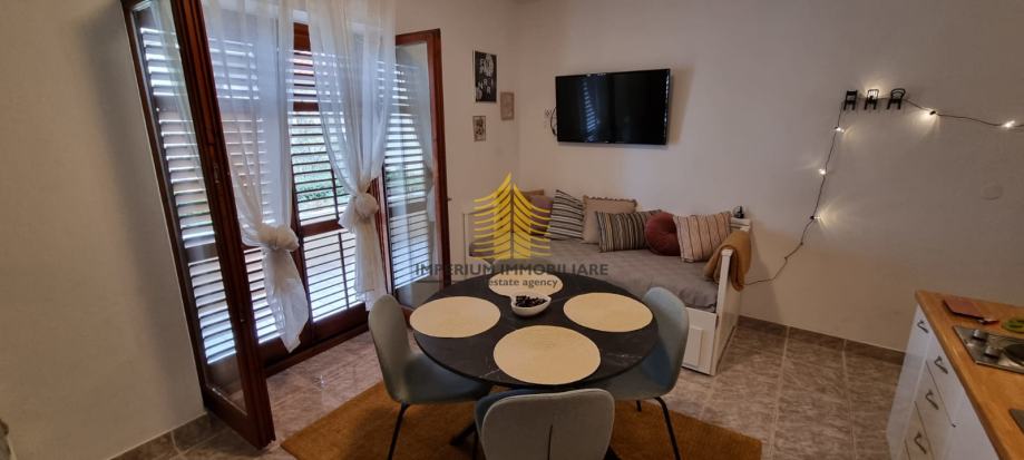 Stan se sastoji od jedne spavaće sobe i dnevnog boravka, a zahvaljujući svojoj južnoj orijentaciji, obiluje prirodnim svjetlom tijekom cijelog dana. Prostrani balkon od 10 m² pruža dodatni prostor za opuštanje i uživanje u pogledu na uređenu okućnicu te more.