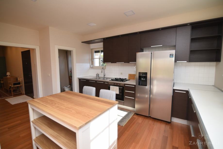Luksuzno namješteni (181 m2) stan na 1. katu urbane vile s liftom. Nalazi se u Podsljemenskoj zoni. U zgradi se nalaze ukupno 3 stana.Sastoji se od: velikog open space dnevnog boravka sa kaminom te izlazom na zimski vrt s pogledom na šumu, kuhinje s malom ostavom, 3 spavaće sobe, 2 kupaonice, balkona, gostinjskog WC-a te spremišta u podrumu (20 m2). Stanu pripadaju 2 vanjska parking mjesta. Autobusna linija za Kaptol prolazi 200 metara od stana.Grijanje je plinsko centralno