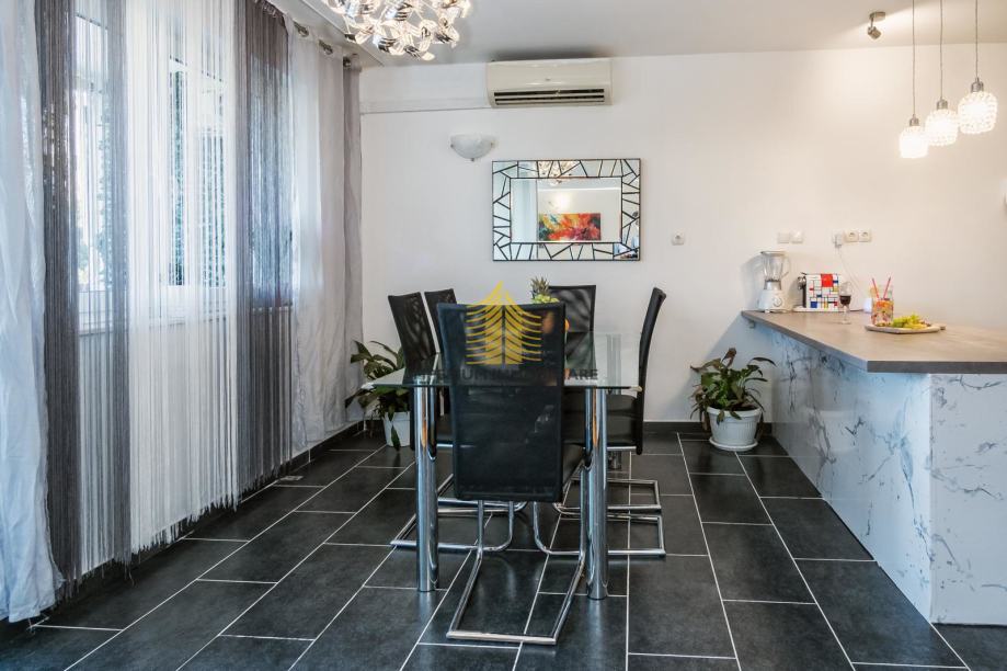 Stan raspolaže s tri spavaće sobe, dnevnim boravkom i balkonom površine 10 m2, pružajući dovoljno prostora za udoban život. Posebno se ističe mirna lokacija te uređena okućnica, što dodatno doprinosi kvaliteti svakodnevnog boravka. Stan je opremljen klima uređajem koji omogućuje ugodno hlađenje i grijanje, a zgrada posjeduje dizalo radi lakšeg pristupa.